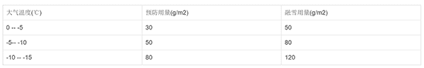 融雪劑即人工拋撒也可機械撒布,拋撒融雪劑時,根據氣溫來確定,一般可在一開始下雪時就撒布融雪劑,或估計路面出現凍結之前1-2小時撒布,如果為了防止路面結成冰,正常可撒一次。在除雪作業時撒布次數可與除雪作業一致,所撒布的融雪劑的使用量見下表。
